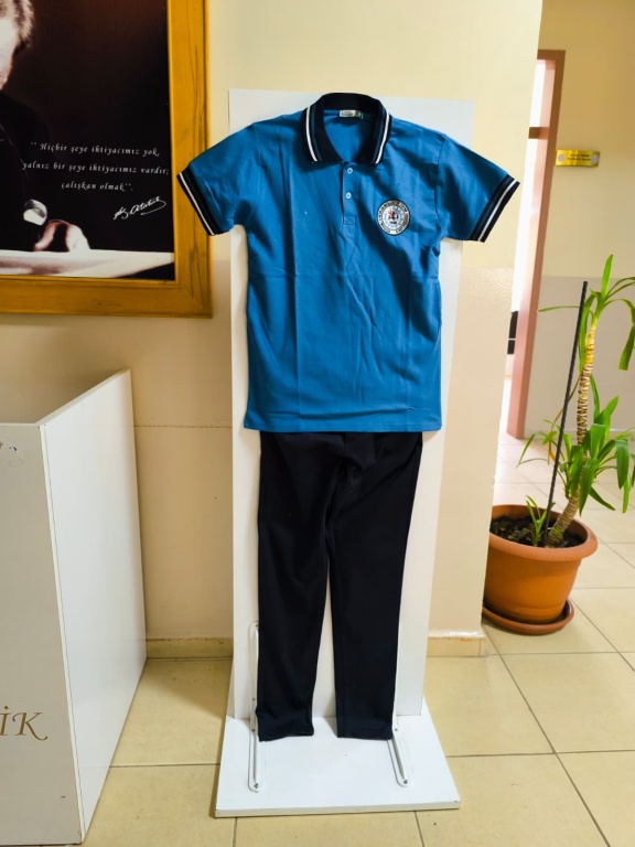 2025-2026 Eğitim-Öğretim yılı Okul Formalarımız LACİVERT Tişört (Yaka ve Kollar Lacivert Beyaz Çizgili) ve SİYAH (Kumaş veya Keten) Pantolondan oluşmaktadır.